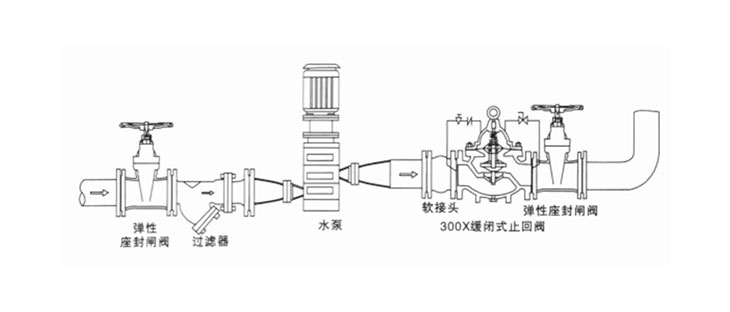 300X緩閉止回閥由主閥、單向閥、針閥、球閥、微形過(guò)濾器和壓力表組成水力控制接管系統(tǒng)。利用水力自動(dòng)操作,可使主閥得到最佳的開(kāi)啟或關(guān)閉速度。選用300X緩閉止回閥可以防止水鍾水擊的產(chǎn)生,以達(dá)到緩閉消聲的效果。當(dāng)閥門(mén)從進(jìn)口端給水時(shí),水通過(guò)微型過(guò)濾器、針閥、單向閥進(jìn)入主閥控制室,再經(jīng)過(guò)球閥排水至下游。因?yàn)獒橀y開(kāi)度小于球閥開(kāi)度,即主閥控制室的排水速度大于進(jìn)水速度,因此控制室壓力降低,作用于主閥盤(pán)下端的進(jìn)口壓力打開(kāi)主閥向下游供水。當(dāng)管道停止供水時(shí),若下游水開(kāi)始回流,一部分回流水經(jīng)球閥進(jìn)入主控制室,由于單向閥作用,回流水不能從主控制室流出,引起主控制室逐漸升壓,緩緩關(guān)閉主閥。該閥利用水力自力控制,不需要其它裝置和能源,保養(yǎng)簡(jiǎn)便,開(kāi)啟及緩閉平穩(wěn)。此閥門(mén)產(chǎn)品廣泛用于高層建筑、生活區(qū)等供水管網(wǎng)系統(tǒng)及城市供水工程。