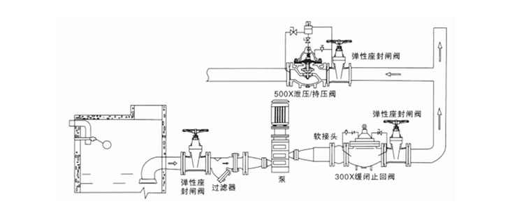 500X泄壓/持壓閥由主閥、導閥、針閥、球閥、微形過濾器和壓力表組成水力控制接管系統(tǒng)。利用水力自動操作,即可以作泄壓閥用又可作持壓閥用。作泄壓閥用時,可維持供水路壓力在設(shè)定的安全值之下;作持壓閥用時,可維持主閥上游水壓在設(shè)定值之上,保持主閥上游供水壓力。