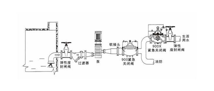 900X緊急關(guān)閉閥由主閥、針閥、導(dǎo)閥、壓力表以及接管等其他管件組成。是一種用于消防用水與生活用水并聯(lián)的供水系統(tǒng)中,用來調(diào)配供水方向的閥門。當(dāng)火災(zāi)發(fā)生時(shí),消防急需大量用水,900X緊急關(guān)閉閥立即切斷生活用水,確保足夠的消防用水;當(dāng)消防停止用水壓力減小時(shí),閥門自動(dòng)打開,呈常開狀態(tài),恢復(fù)生活供水。