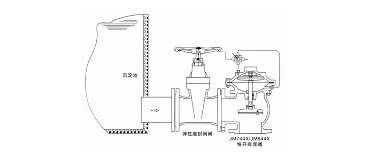 JM744X/JM644XB隔膜式液壓、氣動(dòng)快開排泥閥,是一種由液壓源或氣動(dòng)源執(zhí)行機(jī)構(gòu)的角型截?cái)囝愰y門。通常成排安裝在沉淀池底部外側(cè)壁,用以排除池底沉淀的泥砂和污物。該閥由尼龍強(qiáng)化橡膠隔膜將閥門分為兩個(gè)腔室,接通液壓或氣動(dòng)源。采用電動(dòng)或手動(dòng)二位四通換向閥控制,實(shí)現(xiàn)快速排泥。該閥將隔膜代替活塞,無運(yùn)動(dòng)摩擦,更適用于泥漿等顆粒介質(zhì),大大提高了閥門的使用壽命。